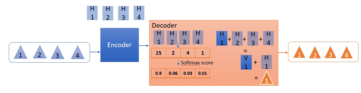 Instead of passing the last hidden state to the Decoder, the Attention model passes all the hidden states to the Decoder with the summary process as below: